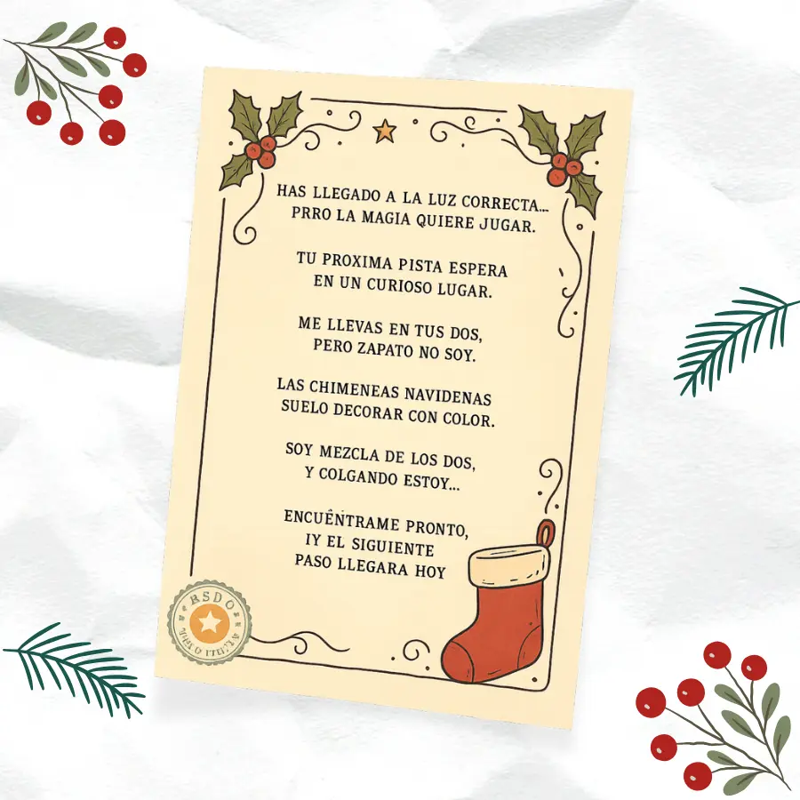 🧩 Historia: Brillito, uno de los duendes mĆ”s importantes de la Agencia Secreta de Duendes Detectives (A.S.D.D.), ha desaparecido… o eso parecĆ­a. Pero nada es lo que crees. Los participantes deben resolver el misterio encontrando las pistas y resolviendo los acertijos para encontrar a Brillito, quien tiene las llaves del Trineo de Navidad.